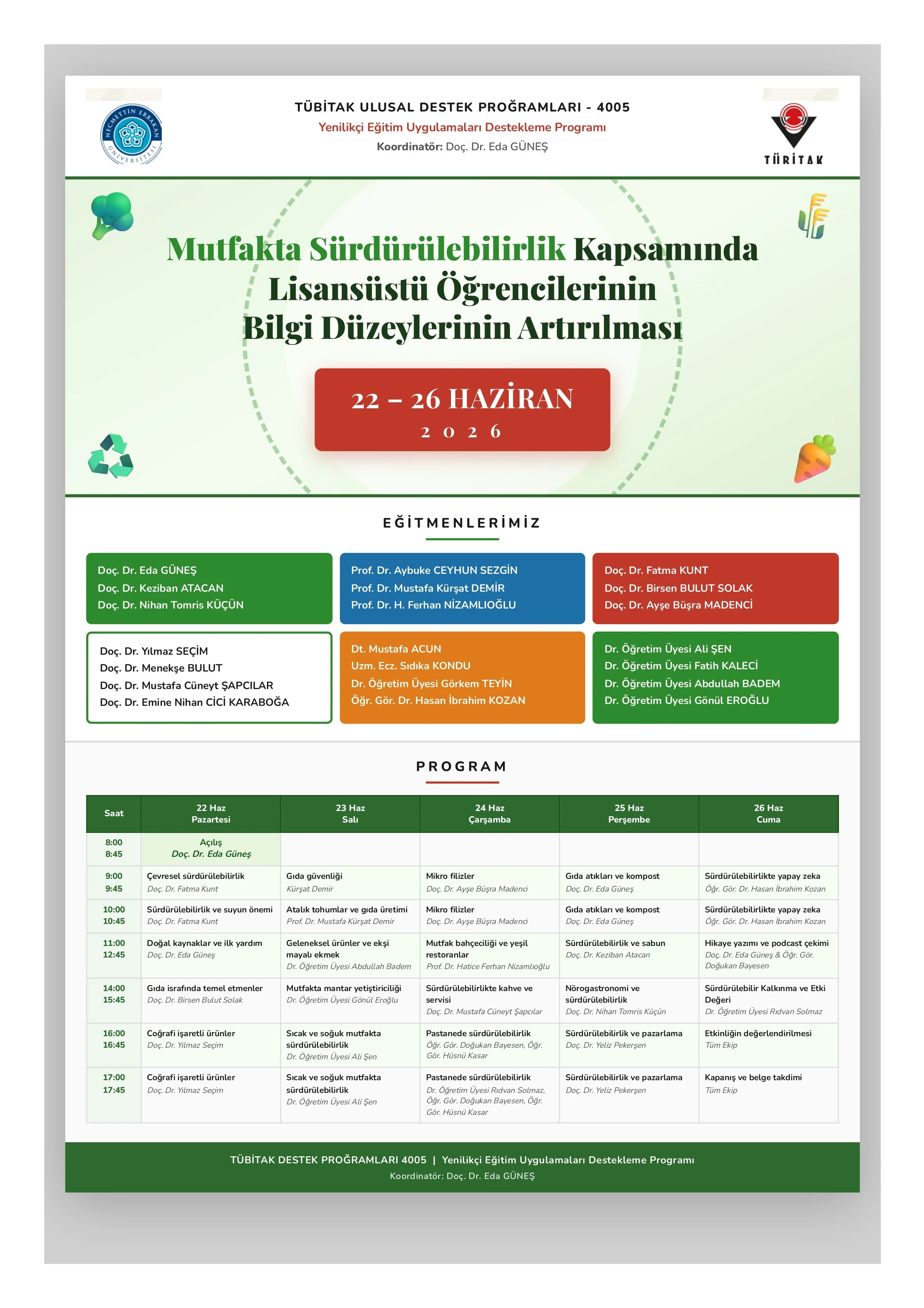 Sayfanın altında yer alan form Necmettin Erbakan Üniversitesi TÜBİTAK 4005 Yenilikçi Eğitim Uygulamaları Programı kapsamında 22-26 Haziran 2026 tarihlerinde gerçekleştirilecek olan "Mutfakta Sürdürülebilirlik kapsamında Lisansüstü Öğrencilerinin Bilgi Düzeylerinin Artırılması" isimli eğitim programı katılım talebi toplamak amacıyla oluşturulmuştur.